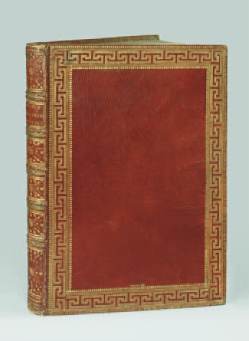 maroquin rouge, roulettes et large grecque d’encadrement, dos orné de fleurons et petits fers, entrenerfs mosaïqués,