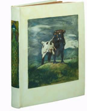 ivoire à la bradel, sur chaque plat, une peinture originale signée de deluermoz, dos orné d’un paon, doublure de