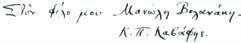 Envoi autographe signé à Emmanuel Volanakis, pour lequel Cavafy a constitué l’exemplaire, dont il a complété la table