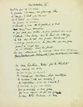 Feuille avec deux brouillons de poèmes, le second entièrement biffé :