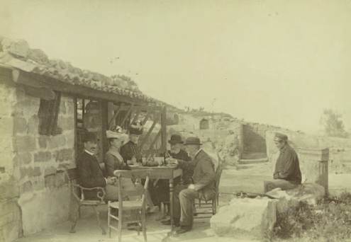 La famille d’Orléans déjeunant à Solunto*, Marquis de Bouillé et Mr Guérin sur le banc du Roi dans le Palais