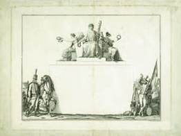 Gravure de J. Duplessis-Bertaux d’après un dessin de Carle Vernet, aux emblèmes de la République et de la vie militaire ;