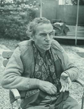 Beau portrait de Céline à la fin de sa vie, assis dans son jardin de Meudon.