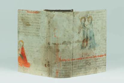 et enluminé de deux figures au lavis de couleurs rehaussées de doré représentant, sur le premier plat, la Visitation et, sur
