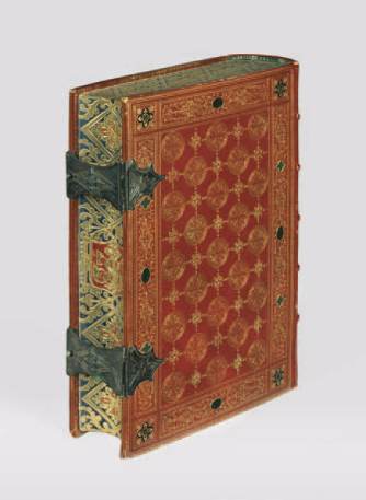 laiton ouvragé, dos richement orné, tranches ciselées aux motifs de feuillages peints en bleu, rouge et doré se rejoignant
