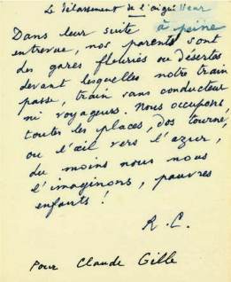 Poème en prose, dédicacé à Claude Gille : « Dans leur suite à peine entrevue, nos parents sont des gares fleuries ou désertes