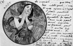 • Illustrateurs Art Nouveau : Carl Jozsa, Raphaël Kirchner, E. M. Kantner, Guarneri …Mucha : août (écrite, non timbrée).