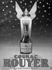Grande affiche, 160 x 120 cm, à décor d’une bouteille de Cognac Rouyer Guillet devant un sphinx, sur fond bleu étoilé. Non entoilée. Bel état.