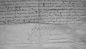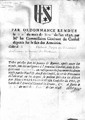 • Extraits des Registres du Conseil d’Etat. L’un (1666) pour la contribution des Officiers du Siège à la réparation de la charpente et couverture de la Grand’ salle du Palais [à Poitiers] tombée par terre « par vieillesse, orage et tempête » , l’autre pour la nomination de notaires (1667).