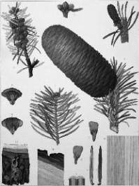 de conifère avec des détails (rameaux, bourgeons, fleurs, cônes, écorce…)