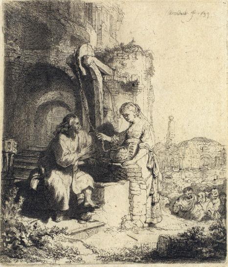 - L E C HRIST ET LA S AMARITAINE PARMI LES RUINES . 1634 (K. G.Boon 71; B. Biorklund 34 -L). 123 x 106. Eau-forte. Très belle épreuve de l’état définitif. Filigrane aux armes. Cachet de l’ancienne collection Gabriel Cognacq (Lugt 538d).
