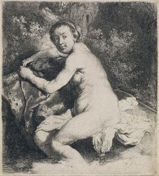 - B ETHSABÉE AU BAIN . 493 x 493. Eau-forte et pointe sèche. Epreuve sur vélin chamois, nombreuses cassures, deux trous de pointe dans les angles supérieurs.