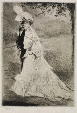 - E N PROMENADE . 1904. (Tabanelli 135). 277 x 196. Pointe sèche. Epreuve sur seul état connu, signée et numérotée 10/ 50, sur Japon. Courtes marges. 300 x 210.