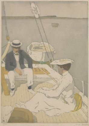 - A BORD . 1903 (Dugnat et Sanchez 3943). 345 x 245. Eau-forte imprimée en couleurs. Epreuve sur vélin légèrement jaunie et oxydée, signée en bas à droite numérotée 10/ 50. Infimes piqures ou taches, petite trace de passe-partout. Cachet de l’éditeur Ch.Héssèle (Lugt 554) au recto. Bonnes marges : 470 x 325.