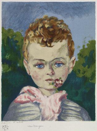 - J EAN -M ARIE AVEC UNE FLEUR A LA BOUCHE . 1950 (Juffermans JL 20). 384 x 296. Lithographie imprimée en couleurs sur vélin. Epreuve d’artiste signée annotée, numérotée XXI/ LX. Cachet sec de l’éditeur P. de Tartas, mouillure dans la marge inférieure.