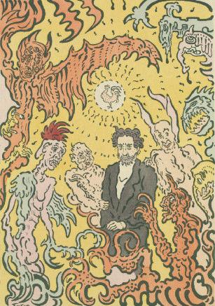 - A FFICHE DE LA PLUME . 1898 (Taevernier 141). 530 x 372. Lithographie imprimée en couleurs. Très belle épreuve sur simili Japon, épreuve d’essai avant le texte annonçant l’exposition de l’oeuvre de J. Ensor au Salon des Cent, 31 rue Bonaparte à Paris. Bords légèrement jaunis, quelques cassures dans les marges, frottement dans la marge supérieure. Feuillet : 645 x 500. Rare