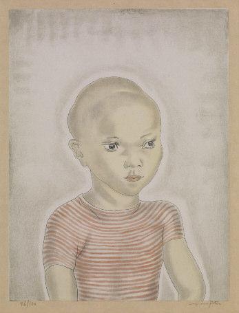 - P ETIT ENFANT AU MAILLOT RAYÉ , 1929. 377 x 287. Eau-forte et roulette, impression en couleurs sur chine appliqué sur Japon. Epreuve signée en bas à droite, numérotée 96/ 100. Petites cassures dans le bord droit du sujet ou dans la marge inférieure du cuivre. Grandes marges.