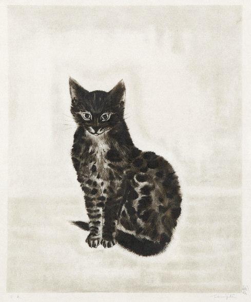 - C HAT NOIR ASSIS . Planche de l’album L ES C HATS , 1929. (S. et D.B. 29- 05). 380 x 310. Eau-forte impression en noir brun sur parchemin. Epreuve signée en bas à droite en français et en japonais, annotée E.A. en dehors du tirage à 10 exemplaires, infimes éraflures légers frottements en surface, quelques plis ondulés dans le sujet, plis cassés et autres plis dans les marges un peu jaunies repliées sur les bords et tendues sur le carton du cadre, quelques trous de pointe. Cadre.