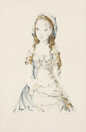 - F ILLETTE AU CHAT . Vers 1950. 385 x 250. Lithographie imprimée en couleurs. Epreuve sur vélin signée en bas à droite, numérotée 218/ 220. Cachet sec de l’éditeur la Guilde de la Gravure dans les marges, bords légèrement jaunis tendus par une bande brune au verso. Feuillet : 550 x 370.