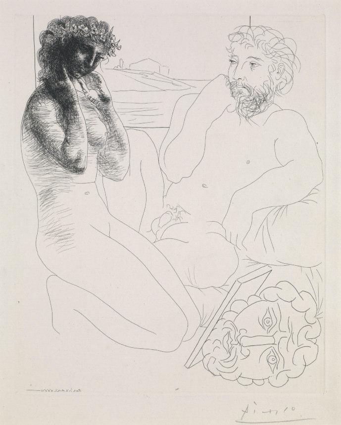 - S CULPTEUR ET MODELÈ AGENOUILLÉ DEVANT UNE FENÊTRE . 1933. Suite Vollard planche 69. (Bloch 178, Geiser et Baer 331). 368 x 298. Eau-forte. Epreuve signée sur vergé de Montval filigrané Vollard. A toutes marges : 450 x 340. Bande de montage au verso sur le bord droit.