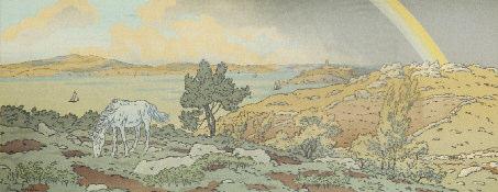 - L’ ARC - EN - CIEL . planche 3 de la Féerie des Heures.1901. 240 x 597. Lithographie imprimée en couleurs. Epreuve sur vélin légèrement jaunie, doublée sur le carton du fond, timbrée en bas à gauche. Petite éraflure dans la marge supérieure, infimes accidents dans les bords, bonnes marges. Cadre.