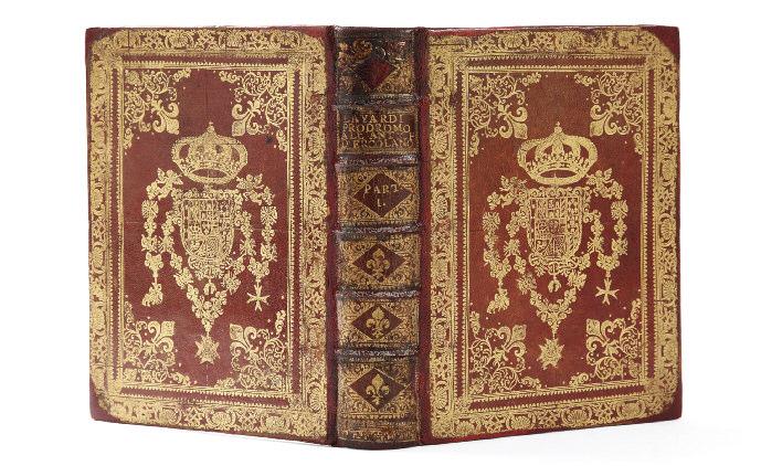 Exemplaire aux armes du roi Charles III d’Espagne, alors duc de Parme et de Plaisance, roi de Naples et des deux Siciles. L’exemplaire lui est dédié. Les armes sont accompagnées des ordres de la Toison d’Or Quelques cahiers brunis. Coins et mors anciennement restaurés.