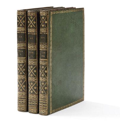 Nouvelle édition, Augmentée & ornée de belles gravures. A Paris, chez les libraires associés, 1785. 3 volumes in-8, maroquin vert, chaine en encadrement sur les plats ; Dos lisse orné. Roulette sur les coupes. Tranches dorées. Encadrement intérieur.