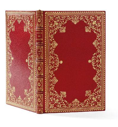 Paris, 1777. in-8; maroquin rouge pastiche, large plaque avec rehaut d’un double filet doré. Dos à nerfs richement orné. Roulette sur les coupes. Tranches dorées. Doublure maroquin moutarde orné d’un jeu de losanges, fleuron central. Contregarde brocard framboise. Chemise à bande à rabats maroquin, dou-blée. Etui. [Ch. Meunier 1904]