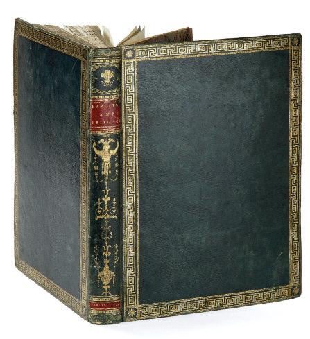 Auxquelles pour donner une idée plus précise de chaque observation, on a ajouté une carte nouvelle et très exacte avec 54 planches enluminées d’après les desseins faits, & coloriés d’après nature sous l’inspection de l’auteur par l’éditeur le Sieur Pierre Fabris, Naples 1776. In folio; maroquin vert à long grain, d’époque (ou tout début du XIXe siècle). Large encadrement grecqué et roulette dorée en encadrement sur les plats. Fleurons aux angles. Dos lisse orné. Rou-lette sur les coupes. Tranches dorées. Roulette intérieure.