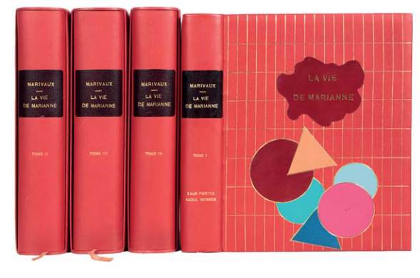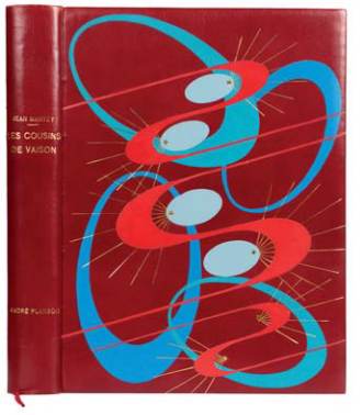 285 ex sur Rives. Reliure in-8 plein chagrin rouge, plats à décors géométriques, contre plats à encadrement dos lisse couvertures