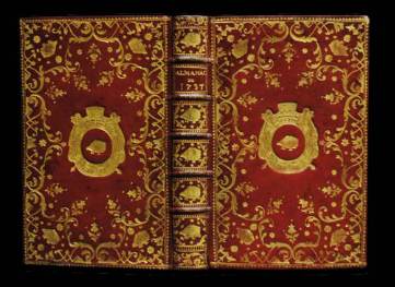 In-8; maroquin rouge, dos à nerfs orné, large dentelle aux petits fers encadrant les plats, symbole héraldique (porc-épic)