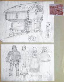 Mine de plomb pour un document de travail sur les costumes et l’habitat norvégien.