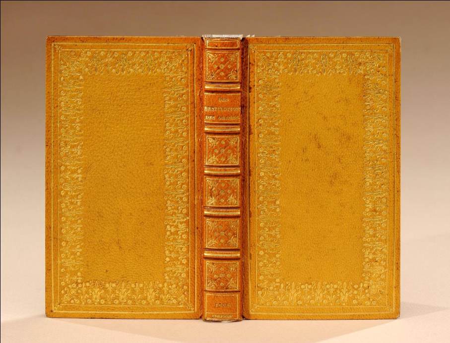 dorés et dentelle dorée sur les plats, filets dorés intérieurs, tranches dorées. (Corfmat, relieur)