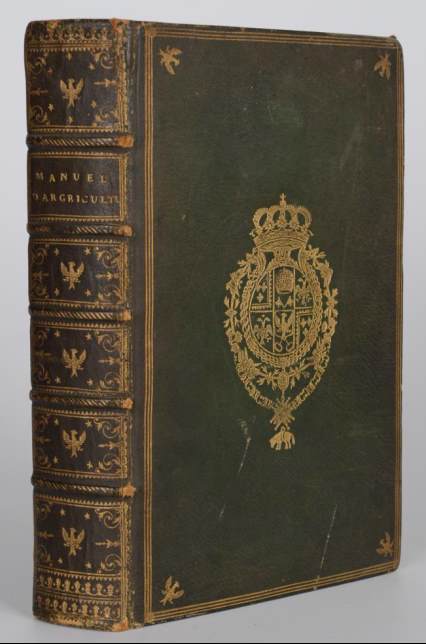 maroquin olive, triple filet sur les plats, plats armoriés, dos très orné, tranches dorées (Reliure de l’époque).