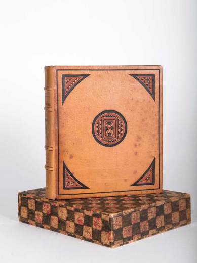 dentelle dorée intérieure, gardes peintes de décors africains, tête dorée, couverture conservée, étui (Reliure