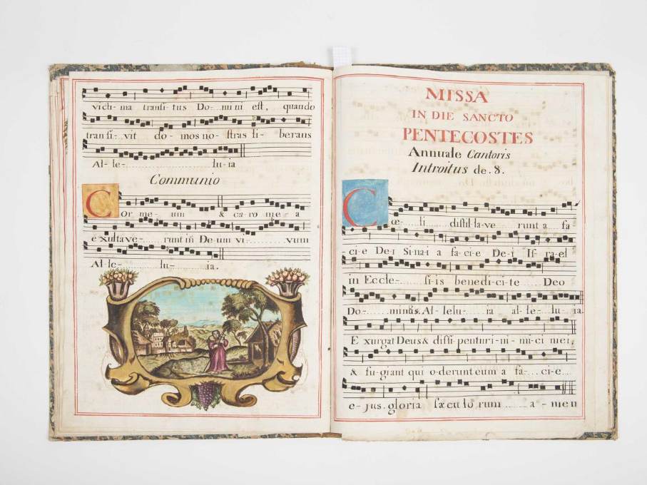 religieuses (Adoration, Ascension, Pentecôte, Vierge à l’enfant,...) Chaque page de musique est ornée d’une