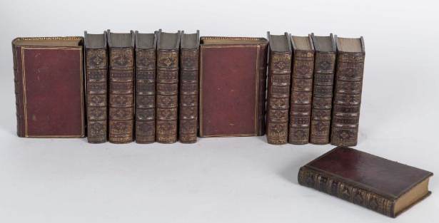 12 volumes in-16, maroquin vieux rouge, triple filet dorés sur les plats, dos