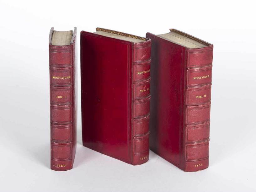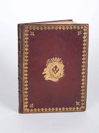 maroquin rouge, dentelle dorée avec fleur de lys aux angles, armes dorées sur les plats, dos à nerfs armorié