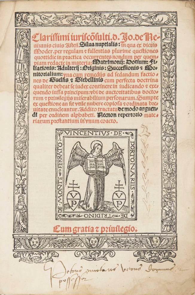 Moylin pour le compte de Vincent Portonaris, éditeur à Lyon de 1506 à 1547. Titre rouge et noir, ex libris