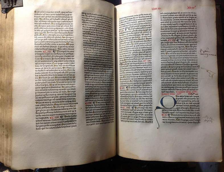 toutes les caractéristiques des premiers imprimés : monumental, imprimé à deux colonnes de 38 lignes sur un
