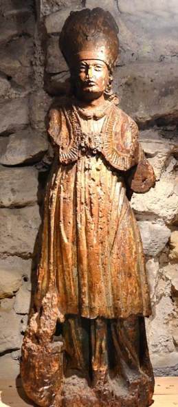 Statue de saint évêque, France du nord, circa 1500. Traces de polychromie ancienne, usure et frottements.