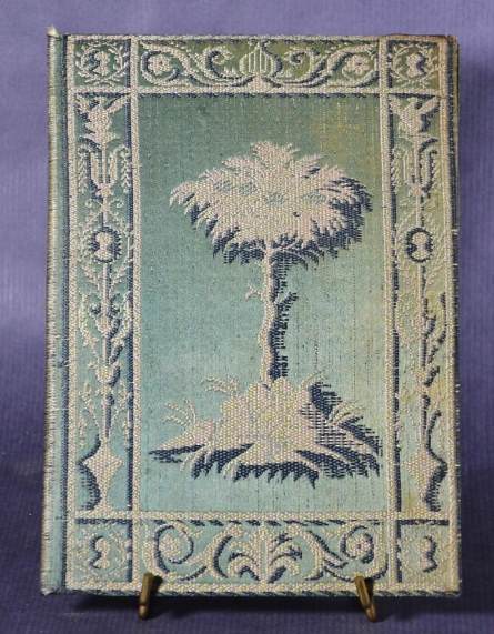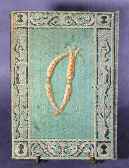 In-8, en soie tissée vert amande, brodée de soie blanche et vert bouteille, plat supérieur orné d’un encadrement à