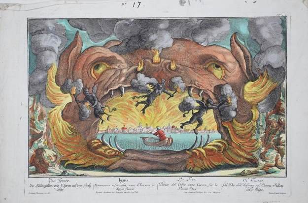 4 grandes gravures XVIIe siècle, légendées de 1 à 4 en allemand, latin, français et
