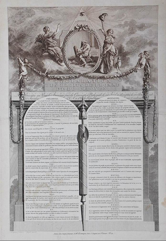 Très rare estampe originale de la Déclaration des Droits de l’Homme et du Citoyen de 1793, portant la faute