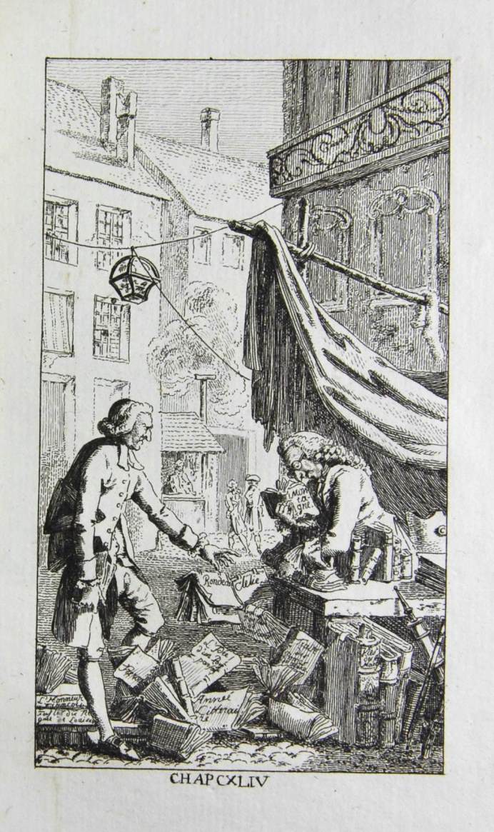 Deux bouquinistes visitent l’échoppe d’un vendeur de vieux livres ; l’abbé s’attache