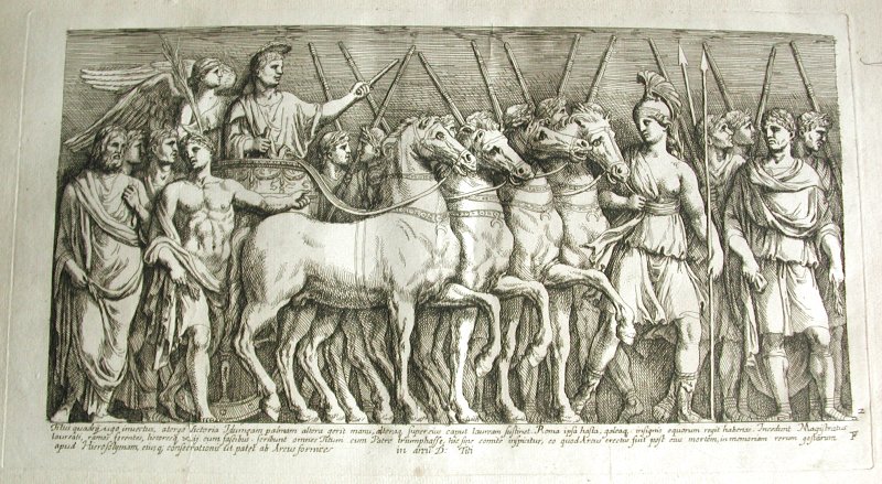 Titus apparaît sur le coté droit, sur le quadrige conduit par la déesse Rome. (Intérieur de l'arcade coté droit)