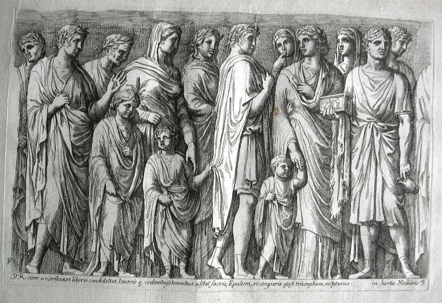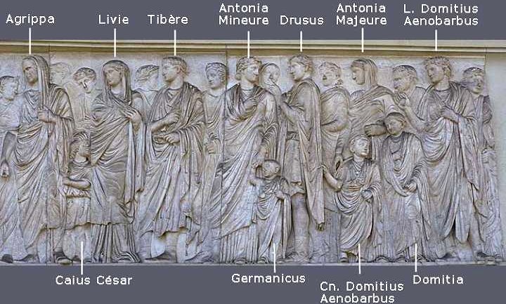 La longue procession de membres de la famille d'Auguste : gendres, filles et petits-enfants. Mais il ne faut pas voir dans cette scène, au demeurant austère, une attention d'Auguste désireux d'immortaliser dans le marbre sa petite famille : la famille en question est enrôlée dans une scène exemplaire, dans laquelle elle doit incarner, conformément à la politique volontariste d'Auguste en matière de morale, un modèle d'union et de fécondité... Inutile de dire que la réalité ne ressemblait que d'assez loin à cette procession édifiante. |