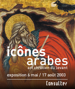 ICÔNES ARABES ~~ ART CHRETIEN DU LEVANT à L'Institut de Monde Arabe (Paris). Exposition organisée en partenariat avec la Maison d'Antioche, le Centre de Conservation du Livre, le Musée des icônes de Francfort, Allemagne, et avec le concours de l'Union européenne. Cette exposition est loccasion de découvrir l'art sacré des Chrétiens d'Orient : un patrimoine riche et prestigieux et un art parachevant la symbiose entre islam et christianismes latin et oriental. http://www.imarabe.org/index.html Exposition : Du mardi au vendredi, de 10h à 18h. Samedis, dimanches et jours fériés, de 10 à 19h. Tarifs : 6 euros (plein) - 5 euros (réduit). Salle dexpositions temporaires - 1, rue des Fossés-Saint-Bernard - 75236 Paris Cedex 05 - Tél. : 01 40 51 38 38 - Fax : 01 43 54 76 45 |