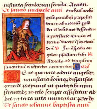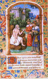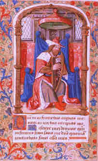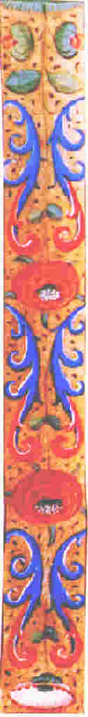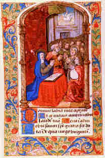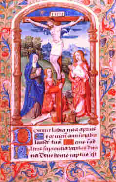 Ce manuscrit est orné de 5 peintures en pleine page, et 13 petites miniatures. Les grandes peintures : L' Annonciation (f 16v°) ; La Crucifiction (f.49 ) ; La Pentecôte (f.51v° ) ; David jouant de la harpe (55v° ) ; Job (66v° ). Les petites miniatures marquent le début des grandes sections des heures de la Vierge, et des suffrages : La visitation, La Nativité, L'Annonce aux bergers, L'Adoration des mages, La Présentation au Temple, La Fuite en Egypte, Le Couronnement de la Vierge, La Sainte Trinité, Saint Michel terrassant le dragon, Saint Jacques, Saint Sébastien, Sainte Marie-Madeleine, Saint Grégoire. Le montage de l'ensemble du manuscrit est intéressant car le texte a été transcrit cahier par cahier, le copiste s'obligeant avec habilité à faire coïncider les cahiers avec les sections des grandes heures. Les grandes peintures ont été exécutées séparément et introduites après cooup dans le corps d'ouvrage (si d'habitude les feuillets blancs sont alors enlevés, ils ont été ici conservés). Les petites miniatures, plus habiles que les grandes, ont été peintes dans les espaces laissés blancs par le copiste. La marge extérieure du recto de chaque feuillet est décorée d'une jolie bordure de fleurs et de feuilles d'arcanthe aux tons très vifs, peinte sur fond or. Les initiales rubriquées sont peintes à l'or sur fonds lie-de-vin ou bleu alternés, les bouts de ligne dito. |