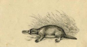 Oberthür (Joseph). Ornithorynque. Pierre noire originale; 21,5 x 12,5 cm.